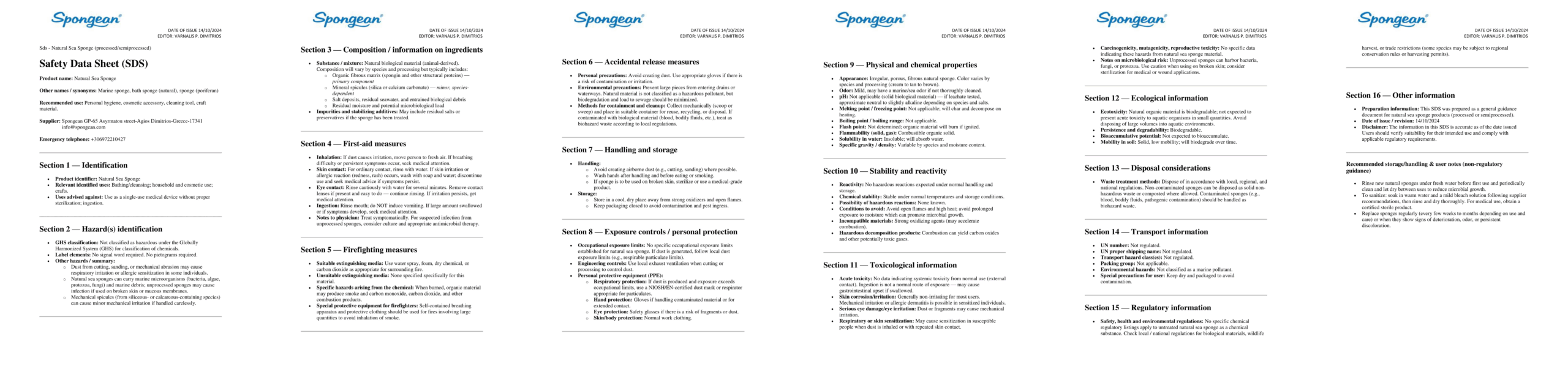 Safety Data Sheets available for natural see sponges and natural loofah sponges upon ordering.